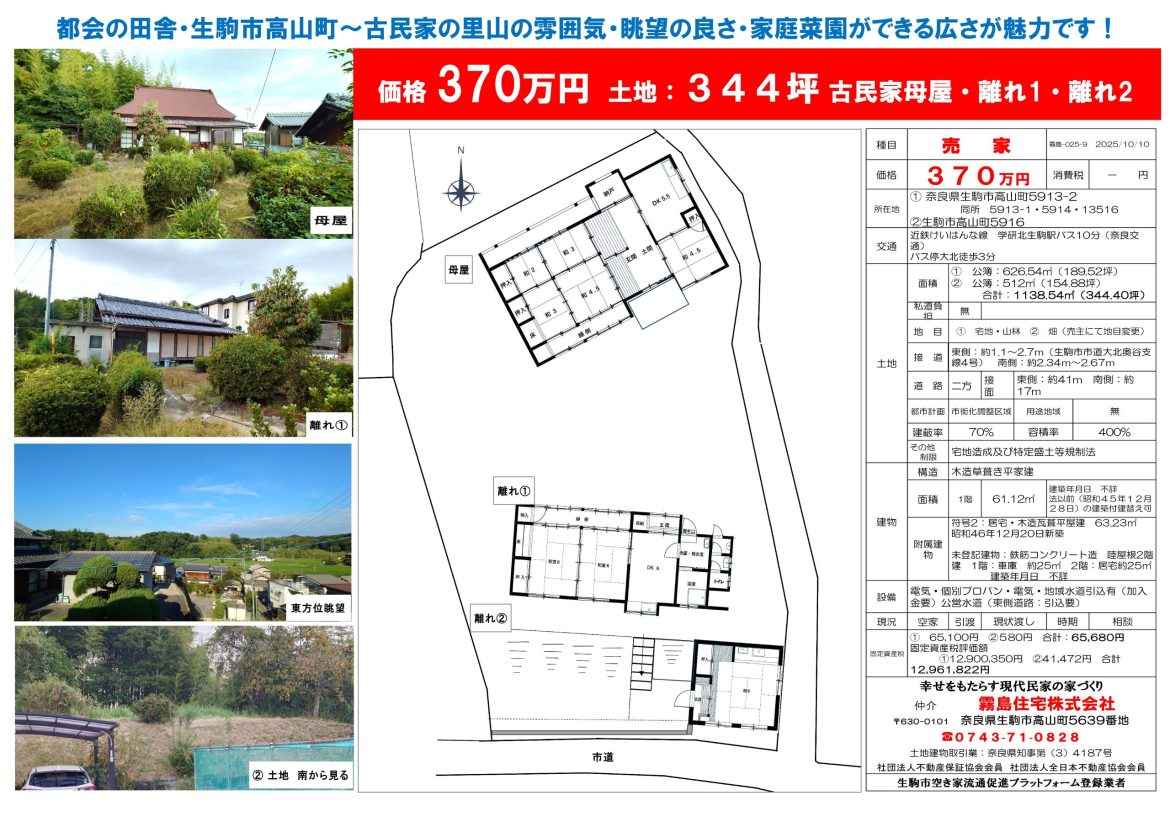 都会の田舎 生駒市高山町 中古住宅370万円 ❣~ ~『古民家の里山・眺望の良さ・家庭菜園ができる広さ』・が魅力です!