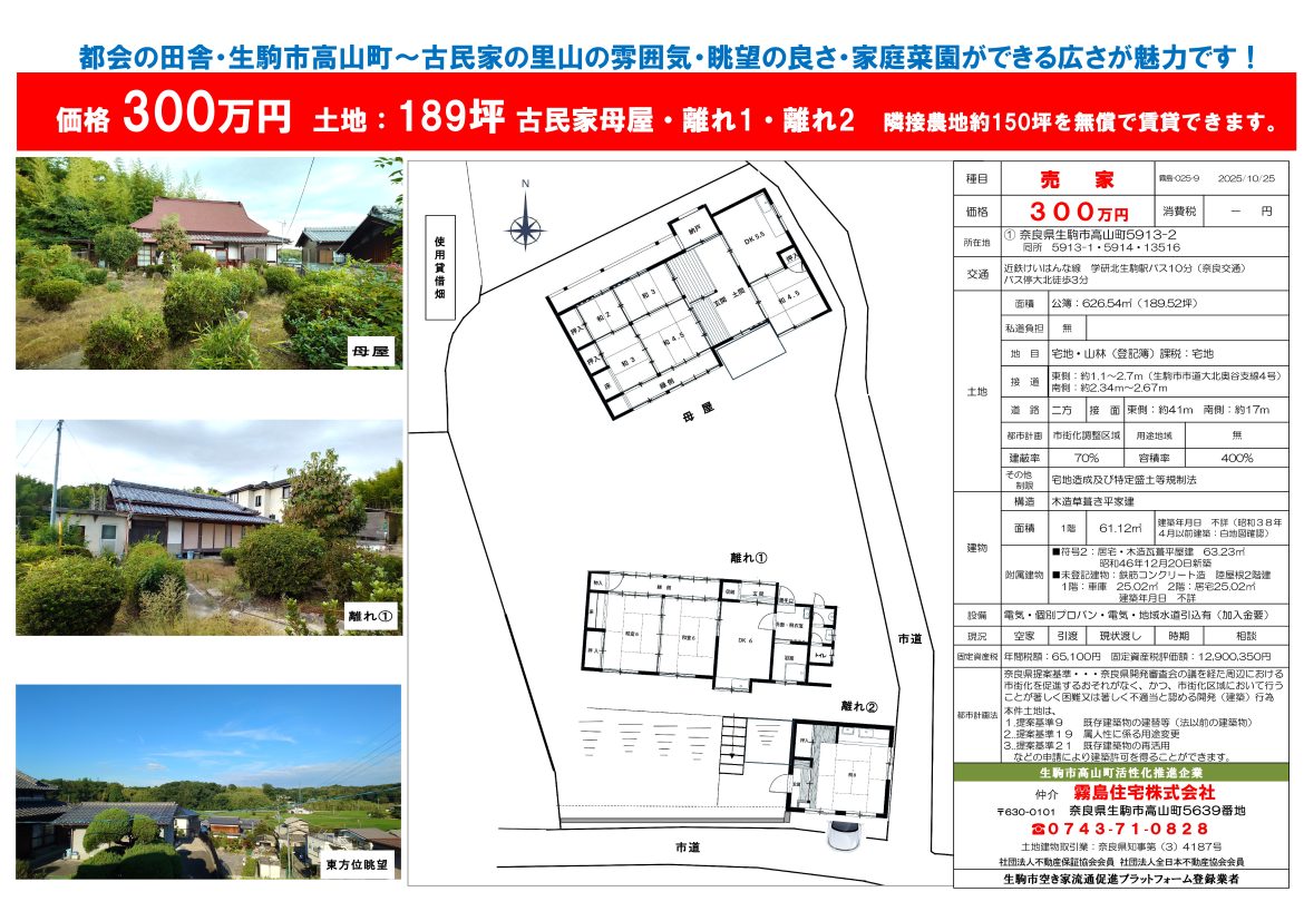 更新しました!『 都会の田舎 生駒市高山町』中古住宅300万円❣ 【古民家の里山・眺望の良さ・家庭菜園ができる広さ】・が魅力です!