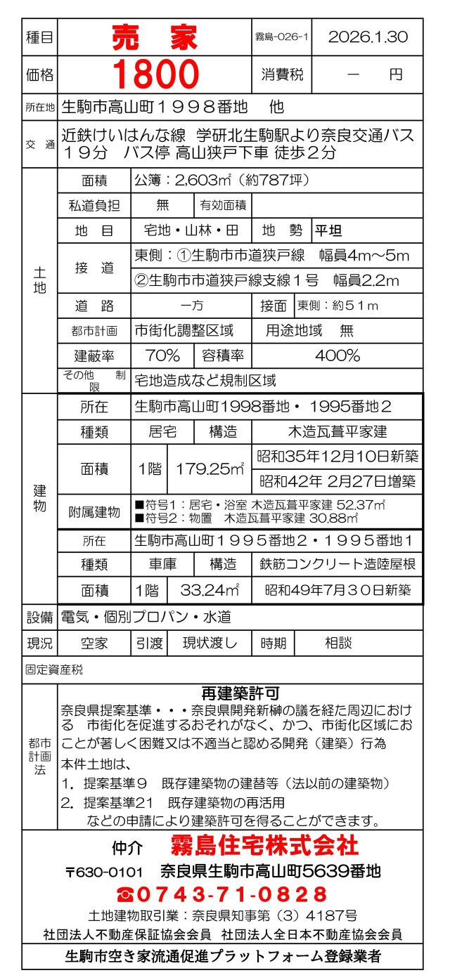 ■土地面積(公簿):約787坪 ■建物:母屋・物置・車庫あり
